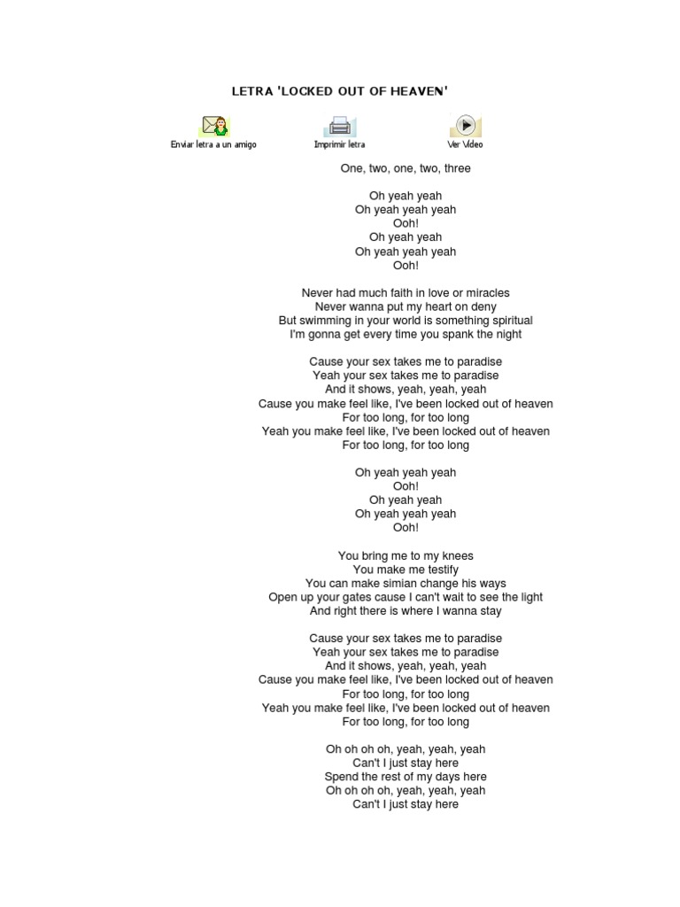 Locked Out Of Heaven Letra Bruno Mars Locked Out Of Heaven se estren. Hmm too young too dumb to realize That I shouldve bought you flowers and held your hand Shouldve gave you all my hours. Locked Out Of Heaven en espaol Ms Letras de Bruno Mars.