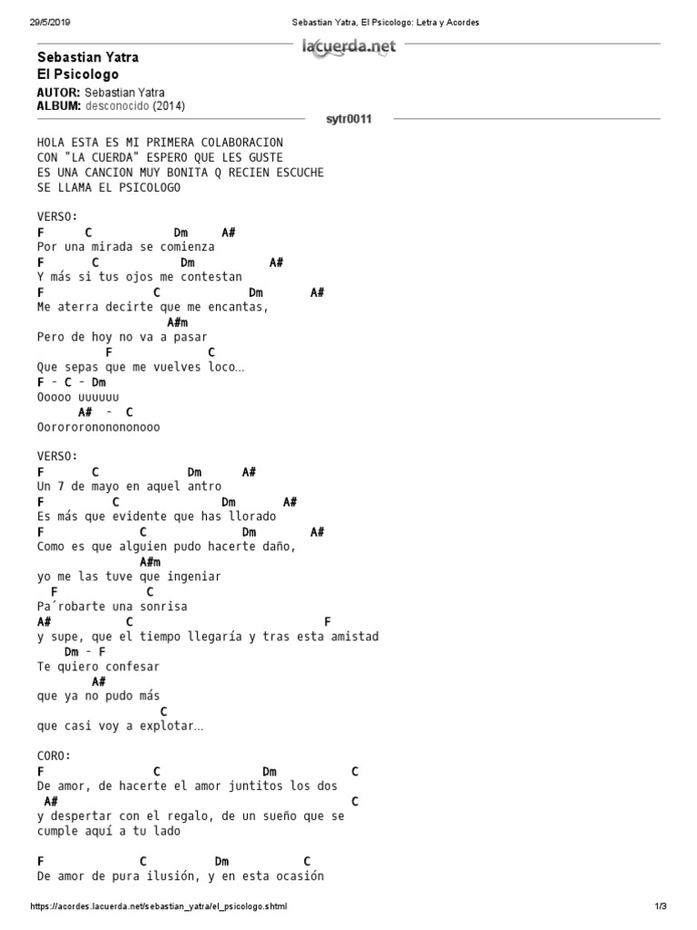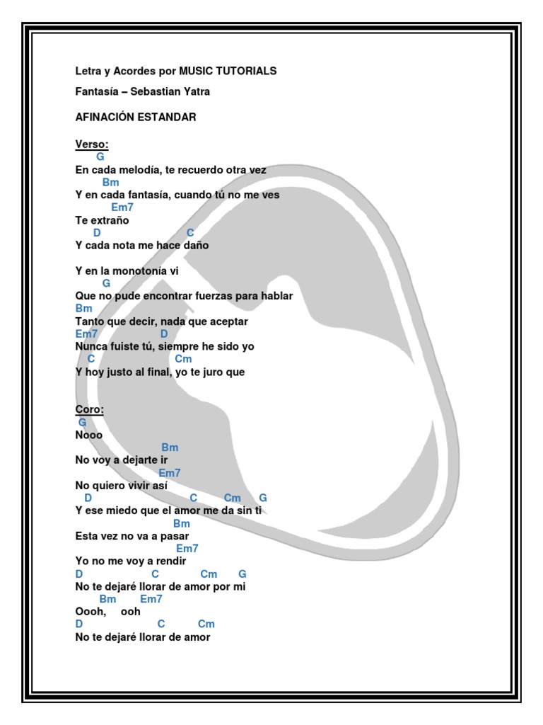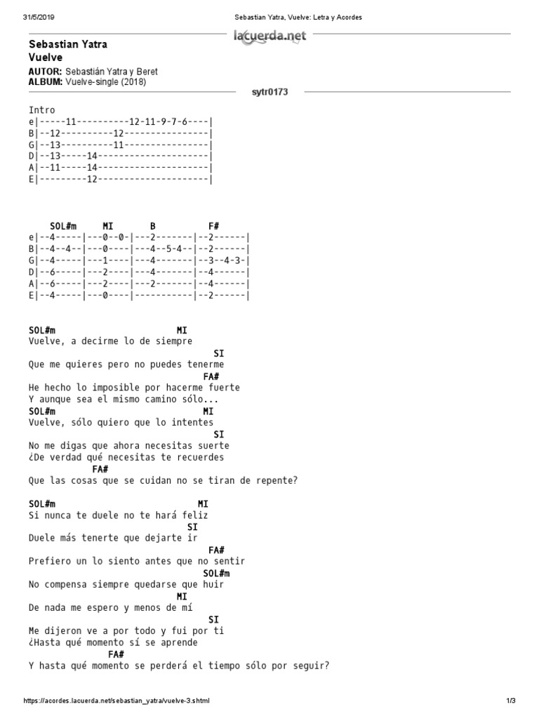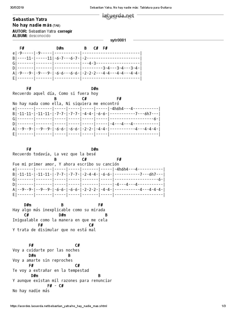 Sebastian Yatra Letras Acordes y Tabs para Guitarra Bajo y Ukulele. Transcripcin x javi29 para wwwacordesdcancio. Letra y msica de sus canciones con notas para guitarra.